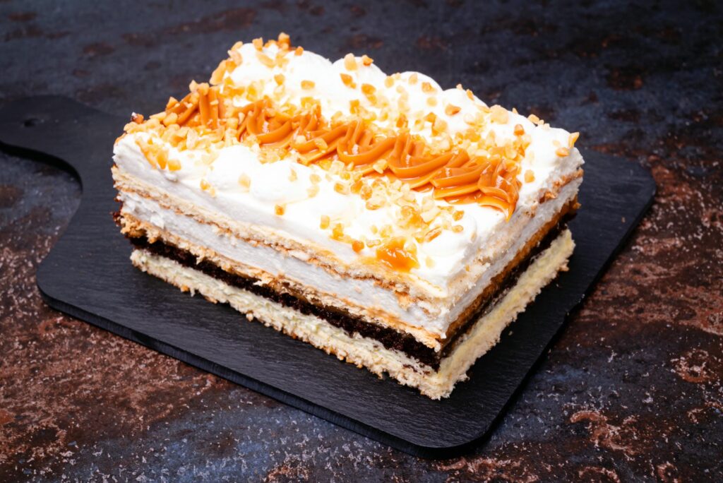 Piekarnia Sezam 3 bit Ciasto z kilkoma warstwami cienkich jasnych biszkoptów i jednej warstwy biszkoptu czekoladowego, przełożone nadzieniem toffi i warstwą herbatników oraz masą śmietankową. Całość wykończona dekoracją z bitej śmietanki, nadzienia toffi i orzeszków
